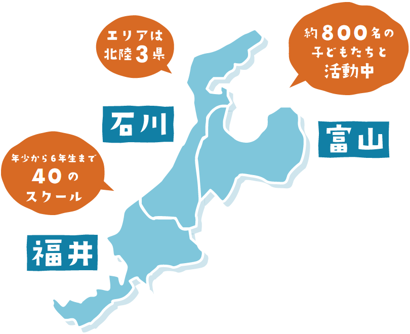 「石川」「富山」「福井」の3県に40のスクールがあり、約800名の子ども達と一緒に活動しております。